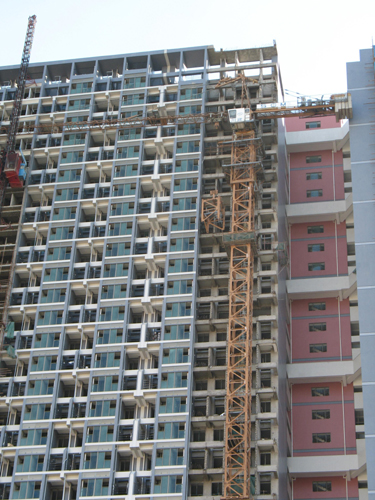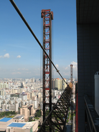 鸿隆广场项目的外部装修工作进展迅速,终于到了拆卸塔吊的时候。由于塔机在安装完成后,建筑物的图纸做了一些修改变更,塔机与建筑物外墙距离空间很小,不能满足拆卸时的要求,使得4#、5#塔机具有一定的拆卸难度。为此,机械公司的相关人员会同项目部的领导多次到现场进行了仔细的察看,最后由机械公司制定出塔吊的拆卸方案。在机械公司的拆卸工人与现场指挥人员的默契合作下,5#塔吊于4月29日被顺利拆卸,4#塔吊则在今天被顺利拆卸。
