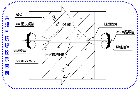 地下室外墙防水混凝土穿墙螺栓也是一个质量通病。一般的常规做法是防水螺栓中间焊上止水钢片,螺栓伸出砼外露部分拆模后割掉。这种做法有两个问题:一是穿墙螺栓与砼之间形成泌水通路,地下水沿螺栓渗入内侧,二是穿墙螺栓切掉后螺栓头暴露于砼墙表面,容易造成锈蚀。为解决这两个问题,项目部改变了穿墙螺栓的常规做法,将螺栓改成高强三接螺栓。具体做法是:螺栓中间用两条Φ8高强钢筋两头焊上螺母,两边侧各用一条Φ12高强螺栓作固定模板,靠模板内侧垫上硬塑垫块,拆模后将Φ12高强螺栓及硬塑垫块取出,螺栓位置形成一个圆而滑的凹洞,然后用膨胀砂浆将小洞封堵。这样避免了留在墙内的螺栓形成泌水通路及螺栓头外露生锈。做法见下图图示: