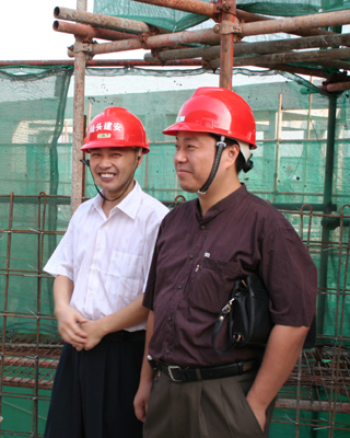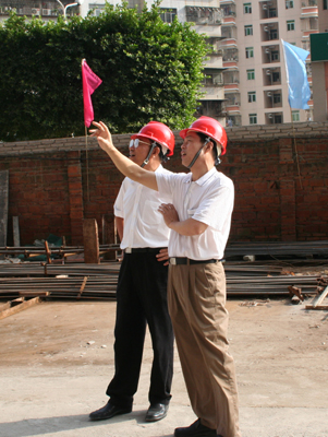 集团公司黄世豪董事长与企业发展部张元发经理在现场讨论工程施工情况 (周幼琼摄)