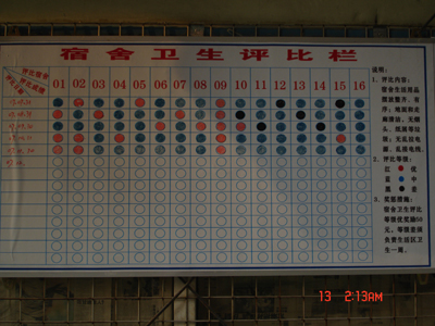 2、工人宿舍:“人性化管理”。工人宿舍管理是后勤管理中的难点,为解决好这个难题,项目部采取了一系列简单而又行之有效的措施,比如给每间宿舍制作统一的长条桌用于存放餐具等日用品;设计晾衣架,将工人换洗衣物进行集中晾晒;定期对工人宿舍进行卫生大评比(如图),对较好的宿舍进行现金奖励等等。