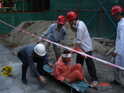 4、安全教育,持证上岗:“教育及时全面,上岗有证”。项目部为做好工人的安全文明教育工作,强化工人安全文明意识,不仅聘请安全教育机构对工人进行教育,组织工人进行“平安卡”考试,开辟安全知识宣传栏,重大危险源公示栏等对工人进行全方位宣传教育,还组织项目部全体管理人员进行各种应急演练(如图)。