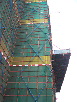 2、本工程脚手架工程为双排钢管扣件搭设,全部采用送检合格的密目式安全网,落地式和悬挑式脚手架施工方案经审批合格。外脚手架每1.8m步踞层层满铺钢筋网片,临边防护落实防护责任人。卸料平台取消以前的钢管斜撑搭法,采用预埋钢筋拉环,悬挑槽钢定型平台并用钢丝绳卸荷的完全独立搭法,达到施工安全、安装方便、美观大方、周转利用的效果。