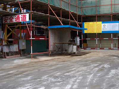 3、为防止高空坠物,在外架第8层和第19层设置了3米宽的安全挡板,在东面临街部分搭设安全防护棚。在大门钢筋加工场地、砂浆搅拌机搭设安全防护棚,搭设安全通道。