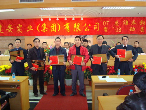 会议由李忠斌副总经理主持,黄少华总经理作集团公司2007年工作总结和2008年工作计划,刘伟光副总经理宣读《关于表彰二零零七年度先进单位和先进个人的决定》(汕建实业[2008]8号),现场还进行了颁奖,先进单位代表发言,最后,由黄世豪董事长发表重要讲话,提出2008年为我司的“效益年”,经济效益、社会效益、管理效益、个人效益各方面要齐抓共管,各单位要重点领会“效益年”的精神,认真贯彻组织落实。会议在热烈、欢庆、祥和的气氛中进行。当晚,集团公司在皇城大酒楼隆重举行2007庆功暨2008开门红庆祝晚宴。(☆ 温伟娇 文 / 蔡澄阳 图)